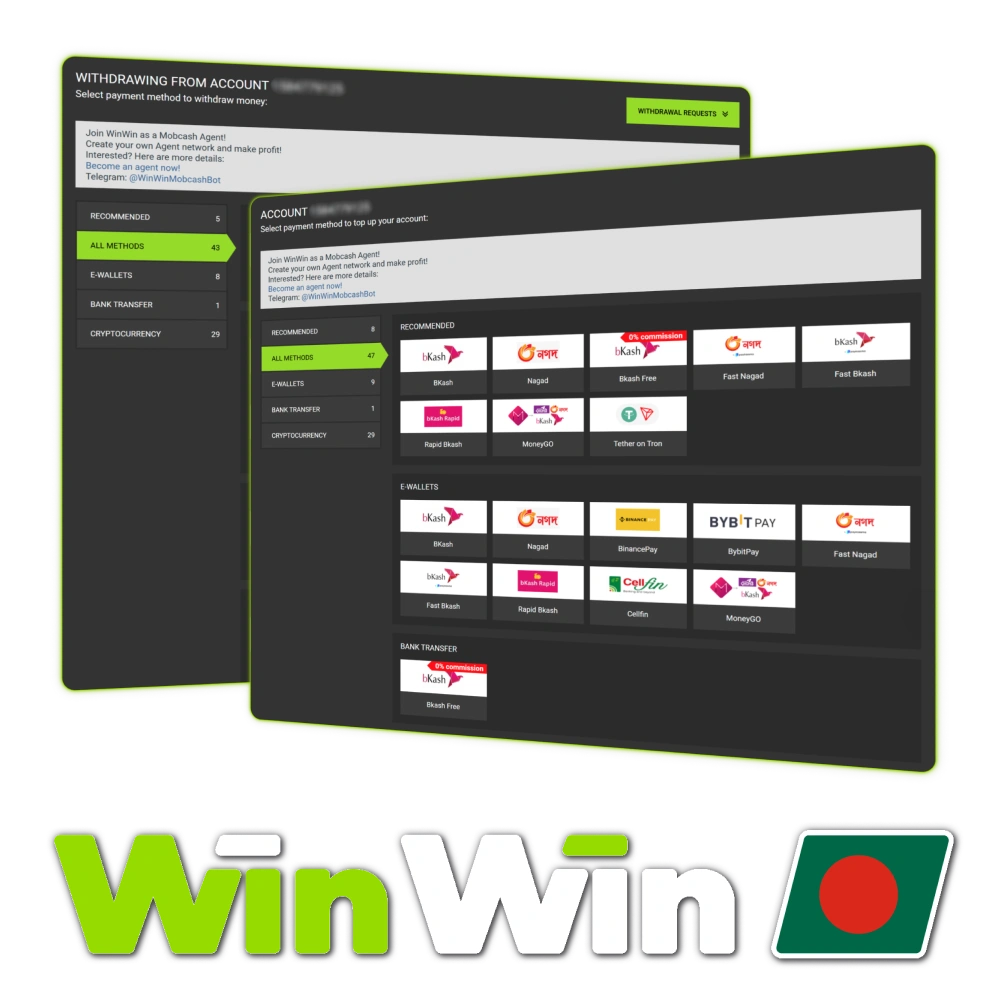 Players in Bangladesh can withdraw money from WinWin using trusted local services. The platform supports bKash, Nagad, Rocket for quick mobile payouts and all of them have a similar minimum withdrawal on WinWin. Bank transfers are also available for users who prefer that option. For those using crypto, USDT is a safe and fast choice. Most methods are processed within hours. Just make sure your payment method matches your account, and your request will go through without delays.